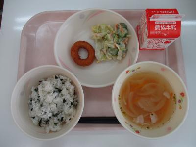~わかめごはん、イカリングフライ、ツナサラダ、じゃがいもとベーコンのスープ、牛乳~