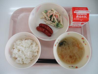 ~ごはん、ウインナーのケチャップがけ、マカロニサラダ、厚揚げのみそ汁、牛乳~