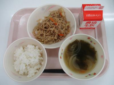 ~ごはん(減)、焼きそば、わかめとえのきのスープ、牛乳~