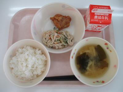 ~ごはん、鶏肉の甘辛がらめ、切干大根のごまマヨ和え、五月汁、牛乳~