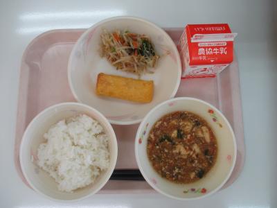 ~ごはん、卵ロール、もやしのピリ辛和え、マーボーどうふ、牛乳~