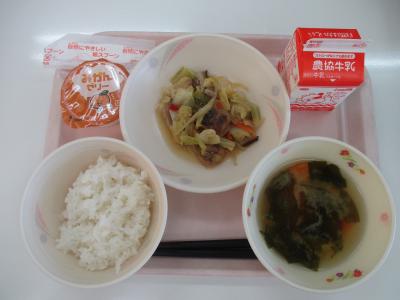 ~ごはん、揚げ魚の野菜炒め、じゃがいものみそ汁、牛乳、みかんゼリー~