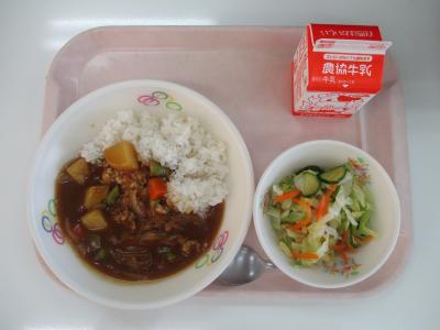 ~(麦飯)、アスパラガスのカレー、キャベツのサラダ、牛乳~