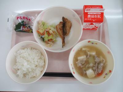 ~ごはん、はたはた唐揚げ、からしあえ、豚汁、牛乳、かしわもち~