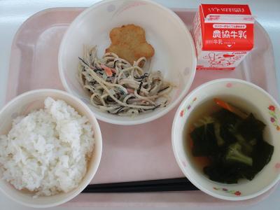 ~ごはん、星のコロッケ、ひじきのサラダスパゲッティ、野菜スープ、牛乳~