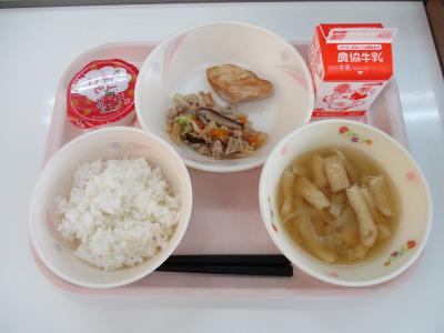 ~ごはん、照り焼きチキン、切り干し大根のそぼろ炒め、キャベツのみそ汁、牛乳~