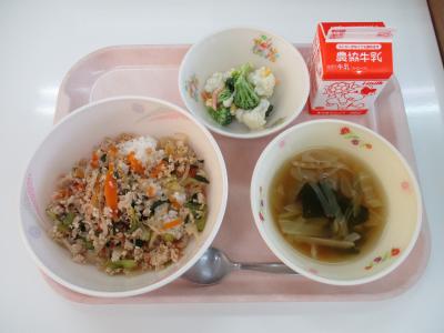 ~(麦飯)、野菜たっぷり鶏そぼろ丼、カリフラワーサラダ、野菜スープ、牛乳~