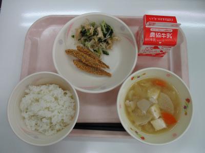 ~ごはん、きびなごフライ、油揚げともやしのあえ物、豚汁、牛乳~