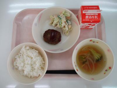 ~ごはん、ハンバーグケチャップライス、ササミサラダ、野菜スープ、牛乳~