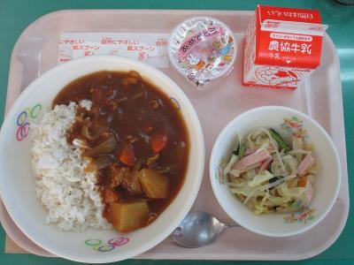 ~(麦飯)、カレーライス、ハムとキャベツの和え物、お祝いゼリー、牛乳~