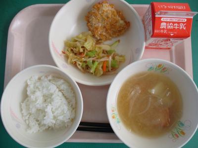 ~ごはん、鶏肉のコーンフレーク焼き、野菜のピリ辛和え、厚揚げのみそ汁、牛乳~