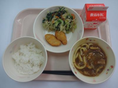 ~ごはん(減)、ナゲット、ほうれん草のおひたし、カレーうどん汁、牛乳~