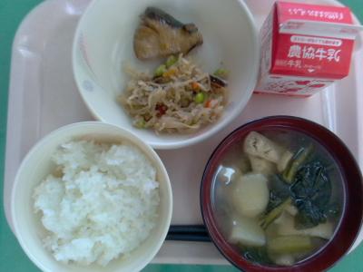 ~ごはん、ぶりの照り焼き、切干大根のそぼろ炒め、じゃがいものみそ汁、牛乳~