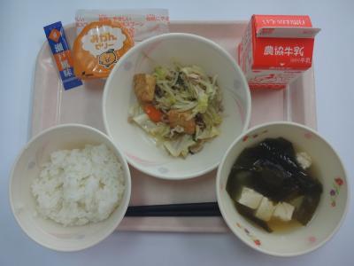~ごはん、ふりかけ、肉野菜炒め、わかめのみそ汁、牛乳、みかんゼリー~