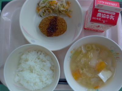 ~ごはん、メンチカツ、もやしの甘酢和え、うち豆汁、牛乳~