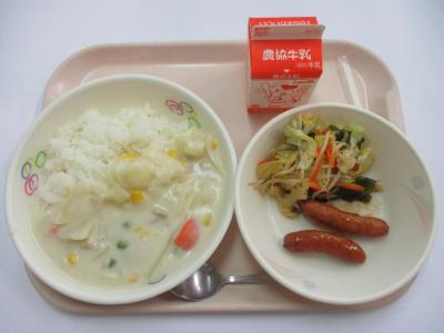 ~(ごはん)、シチューライス、ウインナー、野菜と海藻のナムル、牛乳~