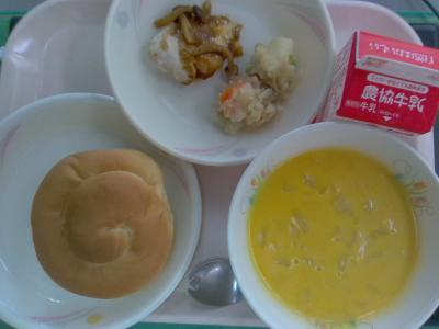 ~ミルクロール、鶏肉のきのこソース、ジャーマンポテト、かぼちゃのポタージュ、牛乳~