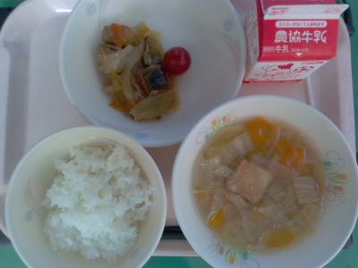 ~ごはん、角切り揚げ魚の野菜炒め、ミニトマト、塩こうじのみそ汁、牛乳~