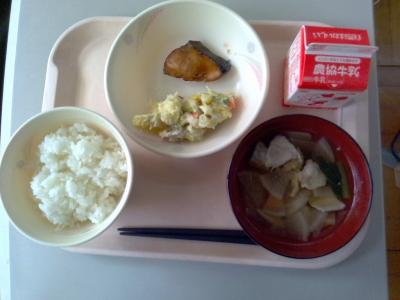 ~ごはん、魚の照り焼き、さつまいもサラダ、沢煮椀、牛乳~