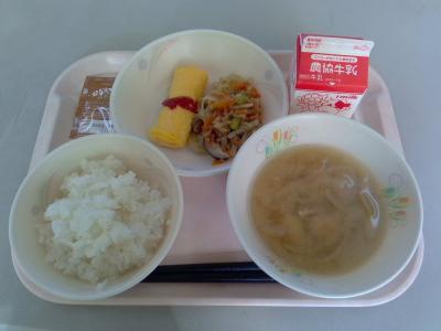 ~ごはん、ふりかけ、卵ロールのケチャップ、切り干し大根のそぼろ炒め、厚揚げのみそ汁、牛乳~
