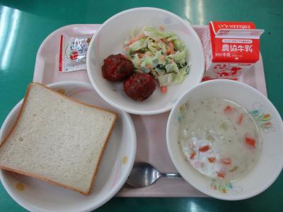 ~ミルク食パン、りんごジャム、ミートボール、小松菜のサラダ、シチュー、牛乳~