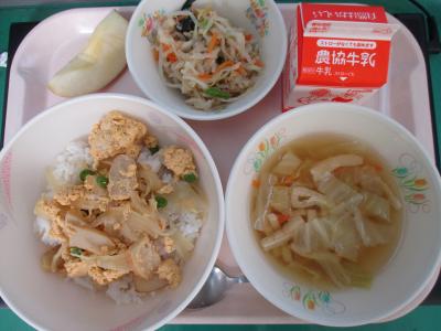 ~(麦飯)、木の葉丼、切干大根のサラダ、みそ汁、牛乳、りんご~