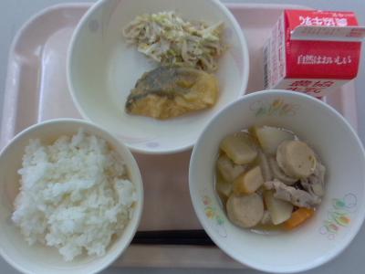 ~ごはん、ふくらぎの生姜みそがらめ、白菜のごま和え、おでん、牛乳~