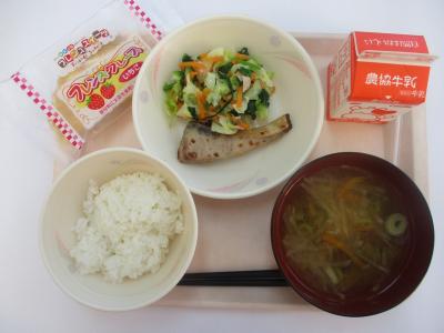 ~ごはん、ぶりの西京焼き、ほうれん草の和え物、なめこのみそ汁、牛乳、クレープ~