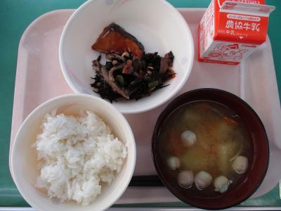 ~ごはん、ブリの照り焼き、ひじきの炒め煮、麩とじゃがいものみそ汁、牛乳~