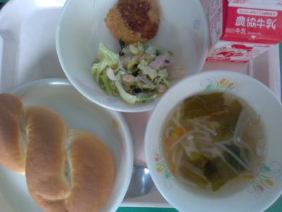 ~米粉パン、チキンカツ、4種の大豆サラダ、コンソメスープ、牛乳~