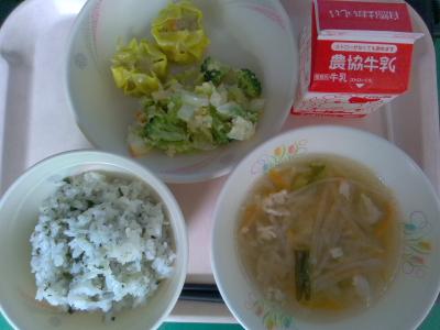 ~わかめごはん、かぼちゃのシュウマイ、卵のサラダ、みそ汁、牛乳~