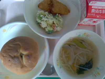~豆パン、アジフィレフライ、ポテトサラダ、もやしスープ、牛乳~