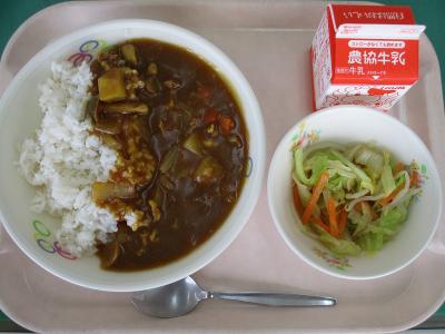 ~(麦飯)、秋味カレー、さっぱり野菜サラダ、牛乳~