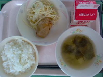~ごはん、照り焼きチキン、スパゲッティサラダ、とうふのみそ汁、牛乳~