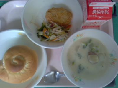 ~ミルクロール、鮭キャベツカツ、野菜と海藻のナムル、さつまいもシチュー、牛乳~