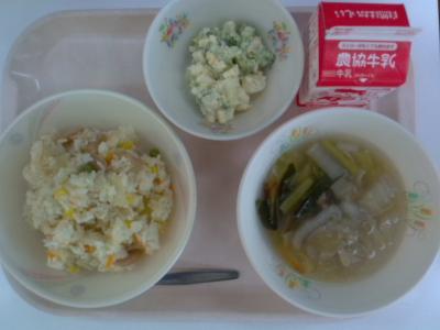 ~ピラフ、卵とポテトのサラダ、春雨スープ、牛乳~