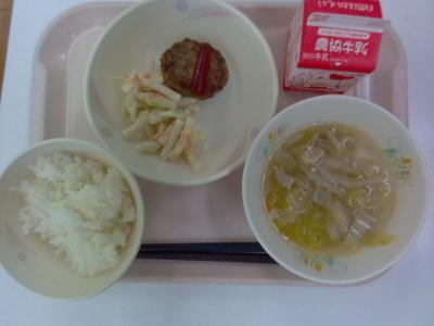 ~ごはん、ハンバーグ、マカロニサラダ、白菜のスープ、牛乳~