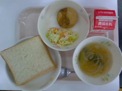 ~セルフハムカツサンド(胚芽食パン、チーズフライ)、コールスローサラダ、コンソメスープ、牛乳~