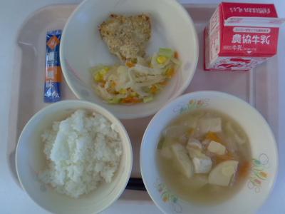 ~ごはん、ふりかけ、鶏肉のパン粉焼き、大根とコーンのサラダ、めった汁、牛乳~