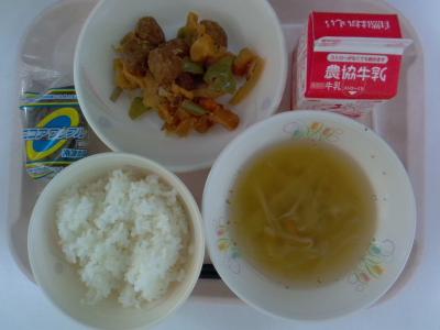 ~ごはん、ミートボールの酢豚風、野菜スープ、牛乳、ココアワッフル~