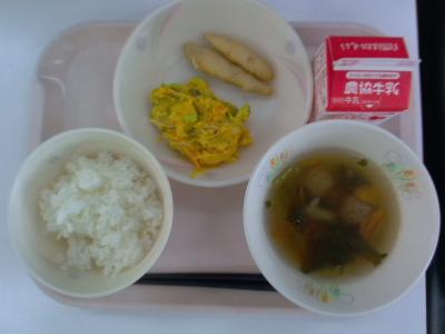 ~ごはん、小魚フリッター、かぼちゃサラダ、鶏団子スープ、牛乳~