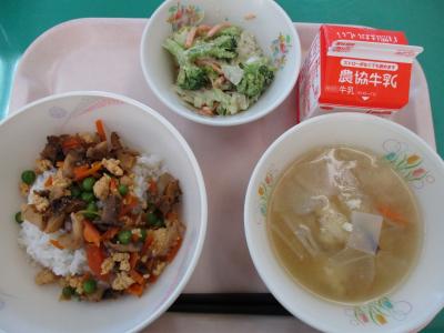 ~(麦飯)、海女採りサザエのそぼろ丼、ブロッコリーのごまマヨ和え、みそけんちん汁、牛乳~