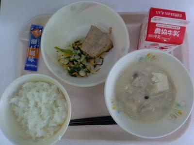 ~ごはん、ふりかけ、魚のスタミナ焼き、キャベツの昆布和え、豚肉の豆乳仕立て、牛乳~