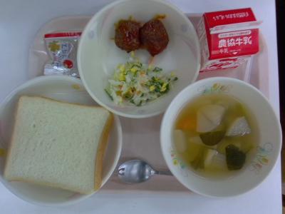 ~食パン、ジャム、ミートボールケチャップあん、コールスローサラダ、ゴロっとコンソメ煮、牛乳~