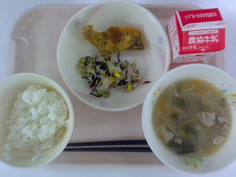 ~ごはん、とびうおのフライ、ひじきのサラダ、野菜と大豆のコーンスープ、牛乳~