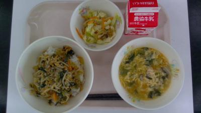 ~(麦飯)、肉みそ丼、ちくわとキャベツの和え物、キムチスープ、牛乳~