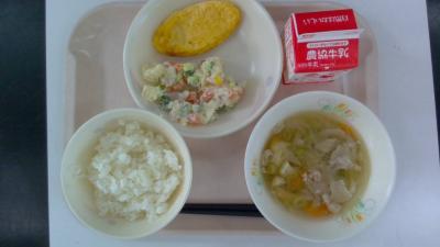 ~ごはん、小松菜オムレツ、マセドアンサラダ、具だくさんみそ汁、牛乳~