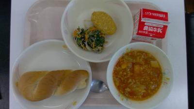 ~米粉パン、コーンコロッケ、ほうれん草のサラダ、厚揚げのチリソース煮、牛乳~