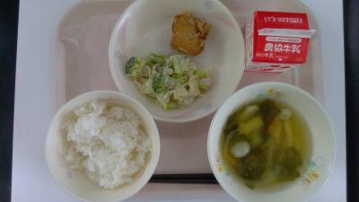 ~ごはん、鶏のからあげ、ブロッコリーとツナのサラダ、みそ汁、牛乳~