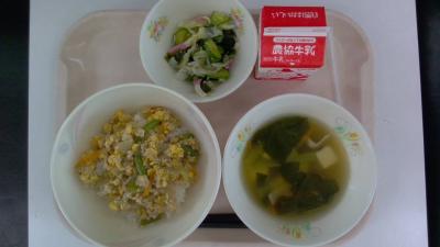 ~麦飯、そぼろ丼の具、しらすとわかめの中華サラダ、春雨スープ、牛乳~